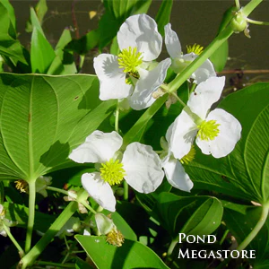 Arrowhead or Sagittaria Latifolia is another mainstay of the water garden with its medium-green, arrowhead shaped foliage. A hardy plant in the north, Arrowhead grows well in moist soil or in shallow water and has fibrous roots that produce edible tubers. Tiny, white, tri-petal flowers with yellow centers bloom on bracts or flowering stems. Native Americans relied on Arrowhead plants for a portion of their diets, often using the tubers in the same way that we use potatoes. This is a captivating plant with handsome foliage and a nice addition to your pond or water garden feature. Arrowhead grows to 3 feet tall. Winter hardy in zones 3 - 11 Looks spectacular in containers! (Arrowhead is also called Duck Potato, Broadleaf Arrowhead or Wapato)The corms are edible and a favorite treat for many ducks! Arrowhead (Sagittaria Latifolia) is only one of many plants for ponds at Pond Megastore
